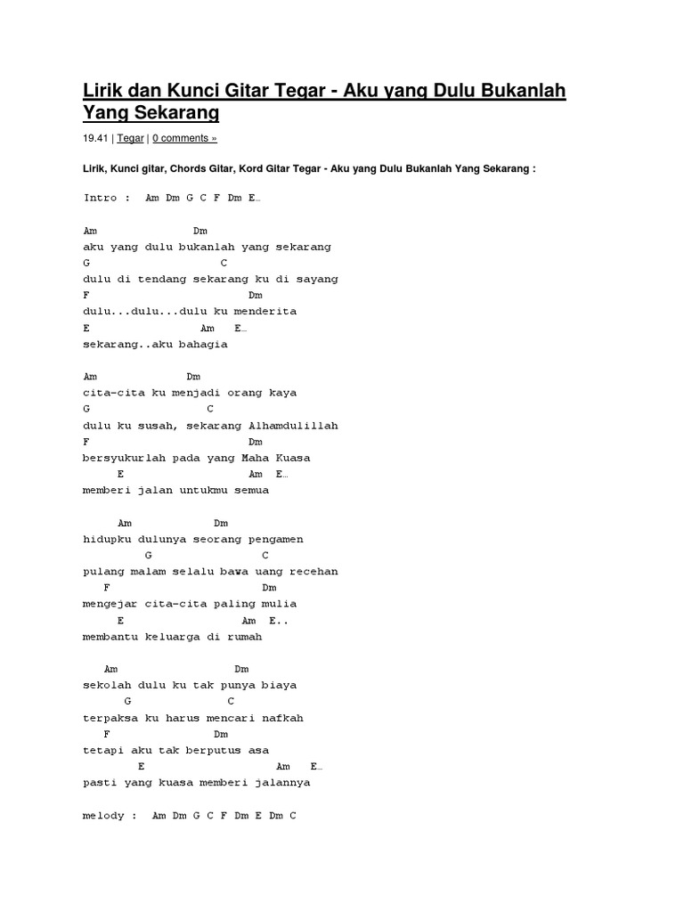 Tegar aku yang dulu bukanlah yang sekarang intro. F dulu dulu dulu ku men dm derita. Sekarang aku bahagia am dm cita cita ku menjadi orang kaya g c dulu ku susah sekarang alhamdulillah. Am dm g c f dm e am dm aku yang dulu bukanlah yang sekarang g c dulu di tenda.